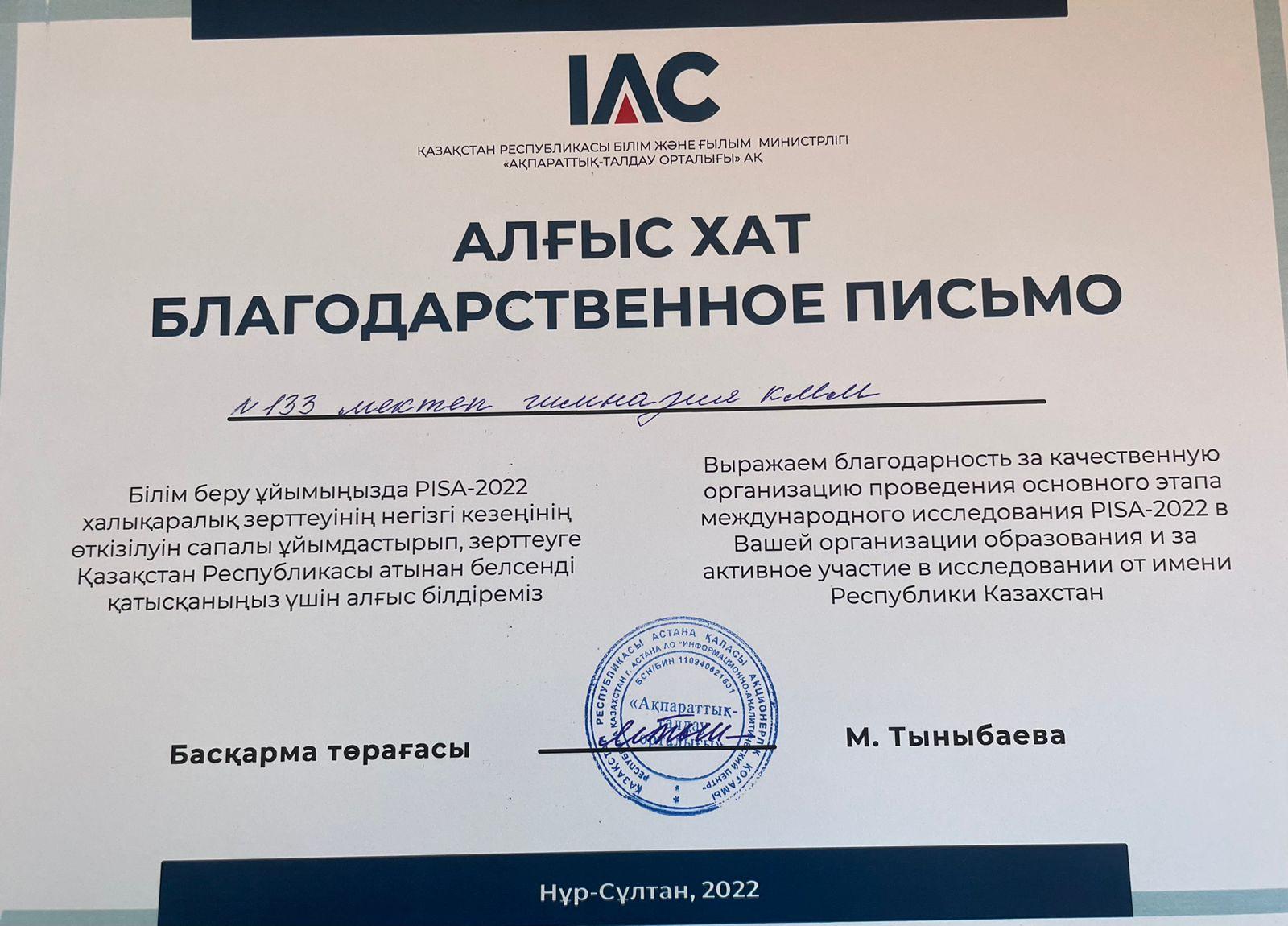5 сәуір күні "№133 мектеп-гимназиясы" КММде "PISA халықарлық зерттеуі" өткізілді. PISA (Programme for International Student Assessment) — Экономикалық ынтымақтастық және даму ұйымы (ЭЫДҰ) 2000 жылдардан бері үш жылда бір ұйымдастыратын әлем елдері арасында 15 жастағы оқушылардың функционалдық сауаттылығын тексеру мен бағалаудың халықаралық бағдарламасы. Аталған бағдарлама қазіргі әлемде оқушылар қабілетін тексеру мен бағалаудың ең ықпалды жобасы болып отыр. Мектеп бойынша 9-10 сыныптың 42 оқушысы аталған зерттеуге қатысып, функционалдық сауаттылық бойынша білімдерін көрсетті. Мектептегі іс-шараның ұйымдастырылуы жақсы деңгейде бағаланды. Зерттеу мәліметтері 15 жастағы қатысушының функционалдық дайындық деңгейін салыстыруға мүмкіндік беріп қоймай, оқыту тиімділігіне тигізетін әсерін анықтауға да мүмкіндік береді.