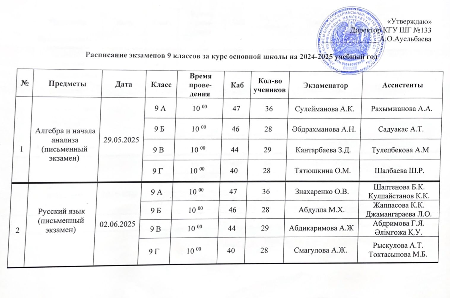 Школа-гимназия №133 » Ақпарат » Негізгі мектеп курсы бойынша 9 сыныптарда емтихан тапсыру кестесі 2024-2025 оқу жылы. Расписание экзаменов 9 классов за курс основной школы на 2024-2025 учебный год