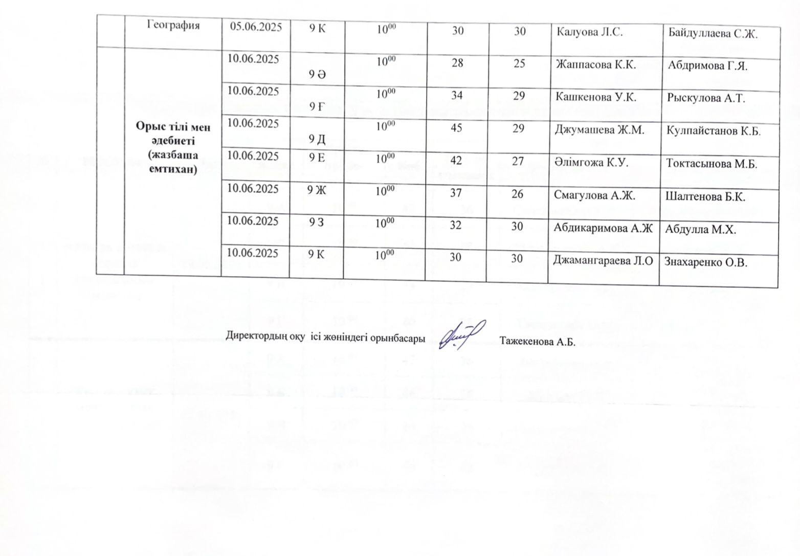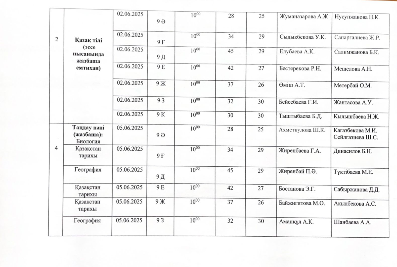 Негізгі мектеп курсы бойынша 9 сыныптарда емтихан тапсыру кестесі 2024-2025 оқу жылы. Расписание экзаменов 9 классов за курс основной школы на 2024-2025 учебный год