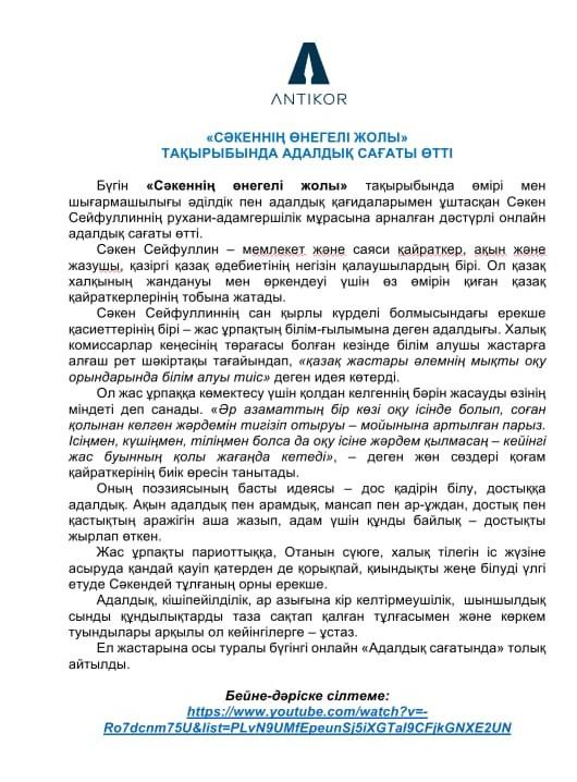 21 декабрь 2020 0 1 2 3 4 5 «СӘКЕННІҢ ӨНЕГЕЛІ ЖОЛЫ» ТАҚЫРЫБЫНДА АДАЛДЫҚ САҒАТЫ ӨТТІ Осы беттің QR-коды:QR-код этой страницы: