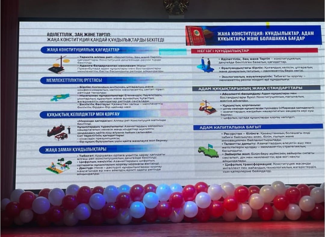Адам - басты басымдық Жаңа Конституция-қоғамның адамға бағытталған жаңа бағыты. Адам құқықтары мен бостандықтары-мемлекеттің негізгі құндылығы. Әр азаматтың қадір-қасиеті қорғалғанда ғана әділетті қоғам қалыптасады. Бұл-заңдағы өзгеріс қана емес,санадағы жаңғыру.