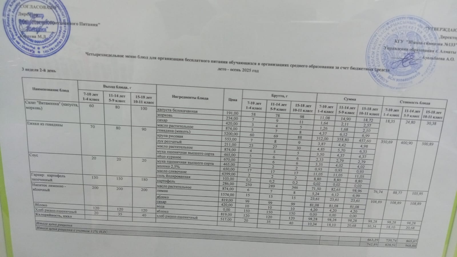 Меню лагерь 27/05/2025 г
